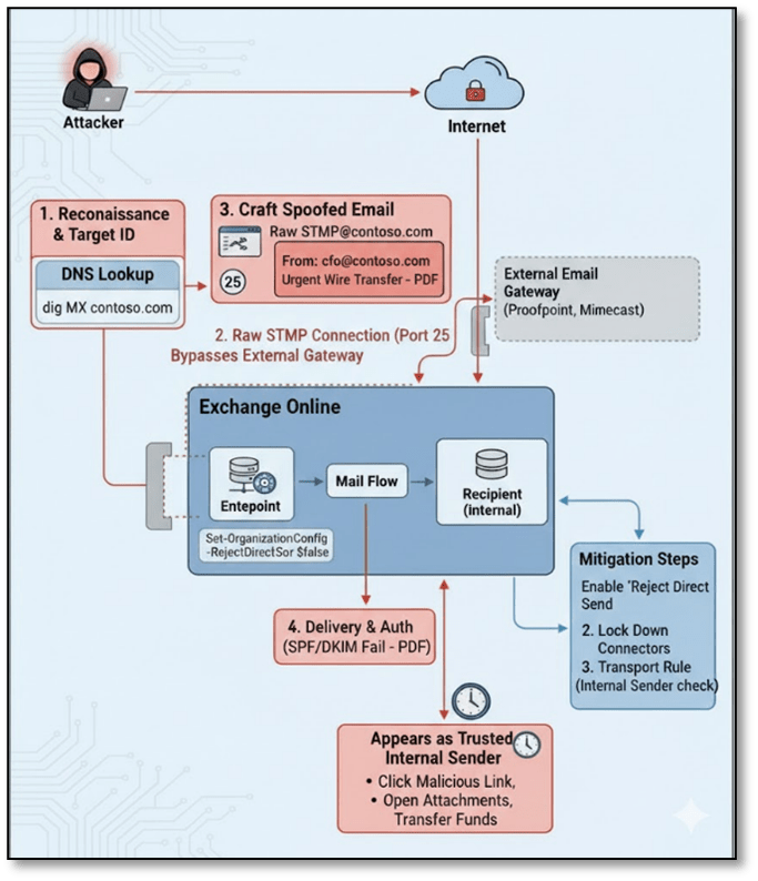 When an attacker obtains or identifies a target organisation’s MX record (publicly available via DNS), they can abuse Direct Send to relay spoofed emails through Microsoft’s own Exchange Online infrastructure. Because no authentication is required, the attacker can set any “From” address including legitimate internal employee addresses making the email appear to originate from inside the organisation.