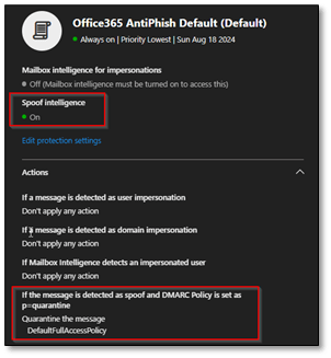 - Set ‘If message is detected as spoof’ to Quarantine or Move to Junk (recommended: Quarantine for high- risk senders)